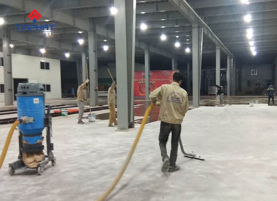 công đoạn này giúp loại bỏ lớp mặt bê tông, hút bụi loại bỏ khuyết tật mặt sàn để bề mặt phẳng và tạo độ bám dính tốt hơn.
