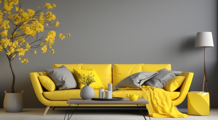 Màu xám ghi khi kết hợp với nền vàng sẽ tạo nên không gian sang trọng và đẳng cấp. Sắc xám ghi lạnh, trung tính giúp cân bằng sự ấm áp của màu vàng, từ đó mang đến sự tinh tế và hiện đại cho căn phòng. Với sự phối hợp này, bạn nên chọn nội thất tối giản với những đường nét mạnh mẽ, kết hợp ánh sáng vàng ấm để tăng sự sang trọng.